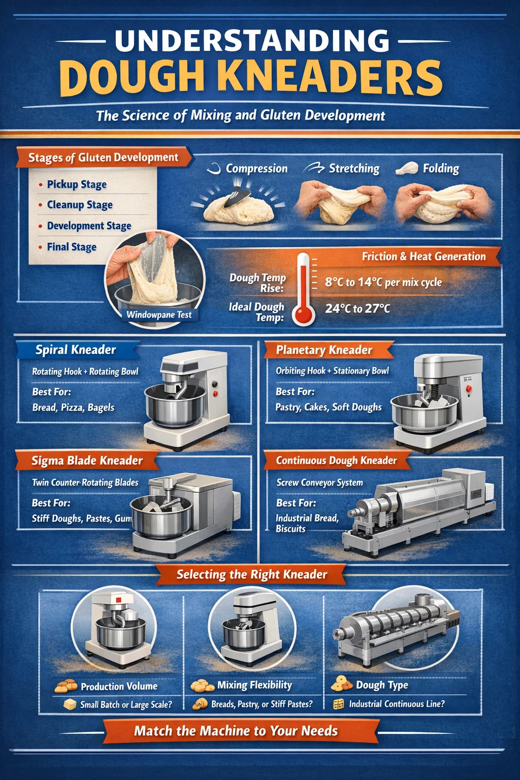 Ein Teigkneter funktioniert, indem er wiederholten mechanischen Druck sowie Falt- und Streckbewegungen auf rohen Teig ausübt und so die beim traditionellen Backen verwendete Handknettechnik nachahmt. Die Maschine treibt einen oder mehrere geformte Rührer – typischerweise Spiralehaken, Planetenrührer oder Sigma-Klingen – mit kontrollierter Geschwindigkeit durch die Teigmasse und bearbeitet dabei kontinuierlich Glutenproteine, bis sie sich zu einem elastischen, zusammenhängenden Netzwerk ausrichten. Diese mechanische Entwicklung von Gluten ist die wichtigste Funktion eines jeden Kneters Und das Verständnis, wie jede Komponente zu diesem Prozess beiträgt, hilft Bäckern, Lebensmittelherstellern und Gerätekäufern, bessere Entscheidungen zu treffen.