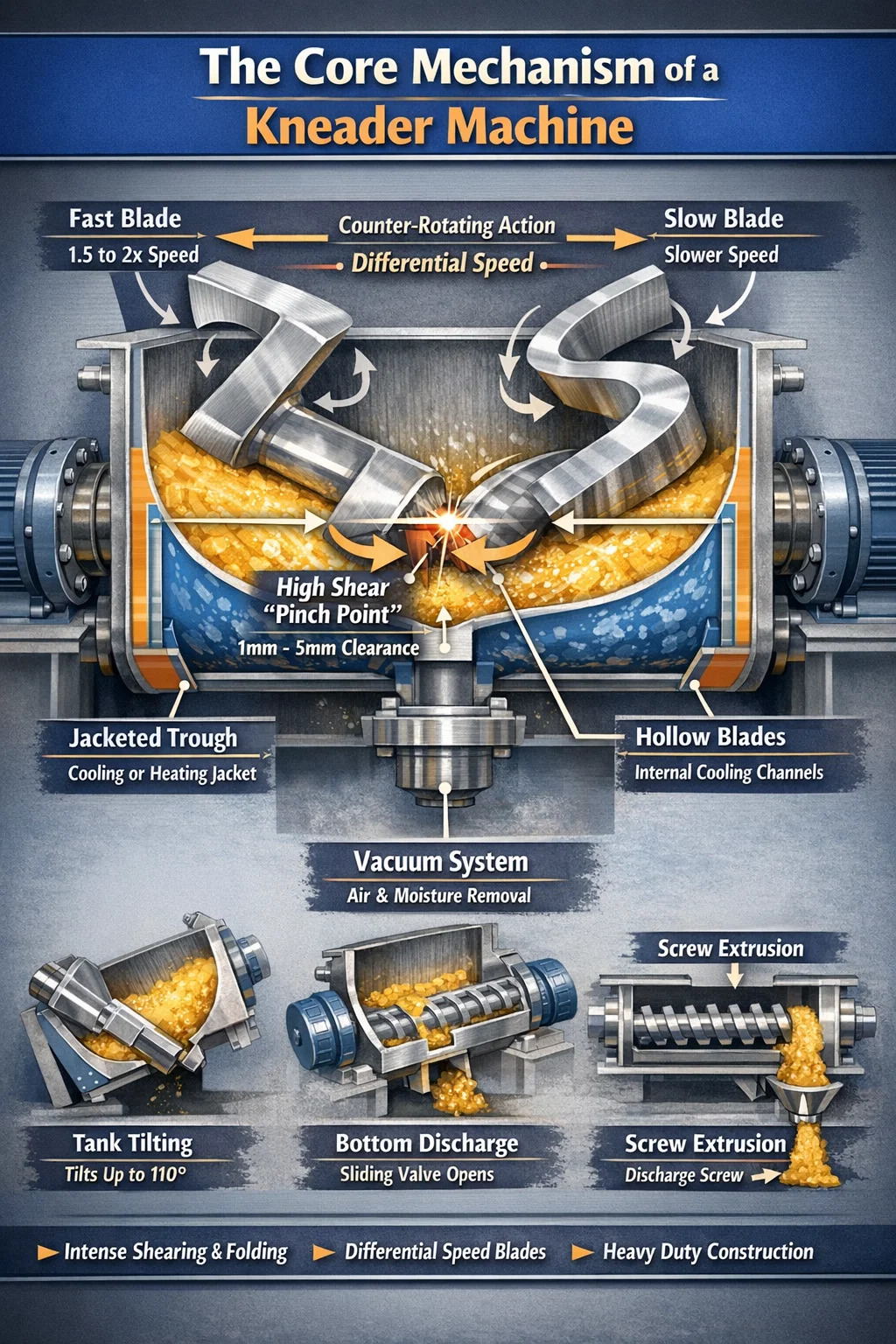 A Knetmaschine funktioniert durch die Verwendung eines Paares gegenläufig rotierender Klingen (typischerweise Z-förmige oder Sigma-Klingen), die in einem W-förmigen Trog mit unterschiedlichen Geschwindigkeiten arbeiten. Das primäre Ziel besteht darin, hochviskose oder halbfeste Materialien zu beaufschlagen intensives Scheren, Falten und Komprimieren . Im Gegensatz zu Standardmischern, die lediglich Material bewegen, drückt ein Kneter das Material durch schmale Zwischenräume zwischen den Schaufeln und den Trogwänden und sorgt so für eine homogene Mischung von Zutaten, die sonst nicht fließen.
