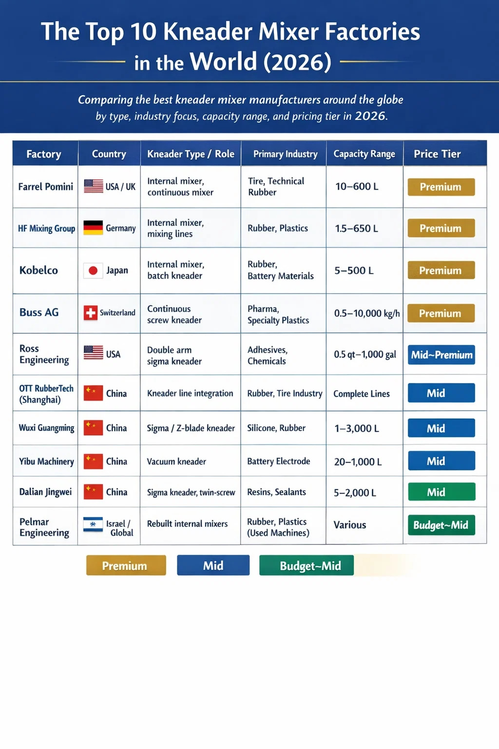 Wenn Sie eine beschaffen Kneter Wenn Sie einen Mischer für Gummi, Silikon, Klebstoff, Batteriematerialien oder andere hochviskose Verbindungen verwenden, bestimmt der von Ihnen gewählte Hersteller direkt die Lebensdauer der Ausrüstung, die Mischqualität und die Gesamtbetriebskosten. Nach der Bewertung des Produktionsumfangs, der technischen Zertifizierungen, der globalen Installationsbasis und des Kundenfeedbacks bei Dutzenden von Lieferanten, Die zehn Fabriken, die im Jahr 2026 bei der Herstellung und Lieferung von Knetmischern durchweg weltweit führend sind, sind: Farrel Pomini (USA/Großbritannien), HF-Mischgruppe (Deutschland), Kobelco (Japan), Buss AG (Schweiz), Ross Engineering (USA), OTT RubberTech International Trading (Shanghai) Co., Ltd. (China), Wuxi Guangming Machinery (China), Yibu-Maschinen (China), Dalian Jingwei Chemical Machinery (China) und Pelmar Engineering (Israel). Jedes bringt eine besondere Stärke mit sich – sei es eine ultrahohe Drehmomentkapazität, ein hygienisches Design in pharmazeutischer Qualität, die vollständige Integration einer Gummiknetlinie oder ein wettbewerbsfähiger Preis für die Produktion mittlerer Stückzahlen.