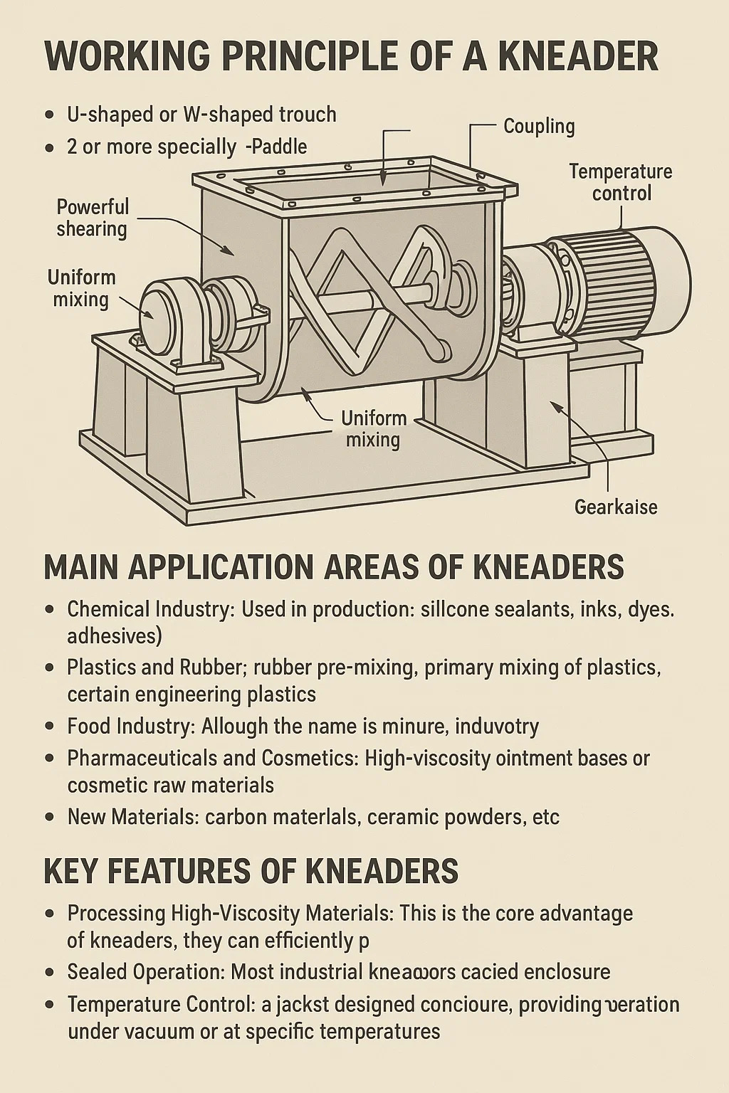 Ein Kneter, auch Mixer oder Teigmischer genannt, ist ein Industriegerät, das hauptsächlich zum kräftigen Mischen, Kneten und Rühren von Materialien verwendet wird, um einen gleichmäßigen, plastischen Zustand zu erreichen. Man kann sie sich wie eine superstarke Rührschüssel vorstellen, aber statt alltäglicher Zutaten verarbeitet sie verschiedene viskose, halbfeste oder hochviskose Materialien, die in der industriellen Produktion ein hochintensives Mischen erfordern.