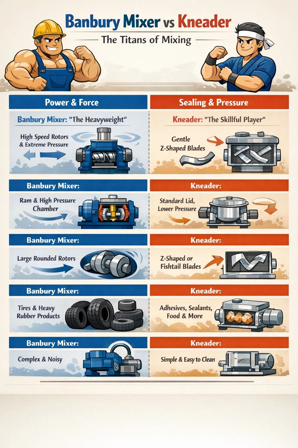 In der Welt der Gummi- und Kunststoffverarbeitung sind **Banbury-Mischer und -Kneter** wie zwei starke Männer mit unterschiedlichen Persönlichkeiten. Obwohl beide viskose Rohstoffe gleichmäßig vermischen können, unterscheiden sie sich deutlich in ihrer Arbeitsweise und Leistung.